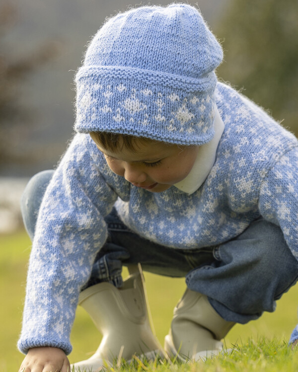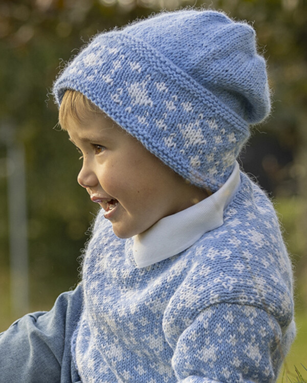 En strikket hue med et smukt vintermønster, der leder tankerne hen på kolde, klare dage Den sidder behageligt omkring ho...