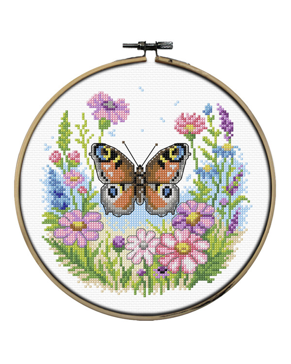 Et lyst og harmonisk broderikit i korssting med en smuk sommerfugl omgivet af farverige sommerblomster.