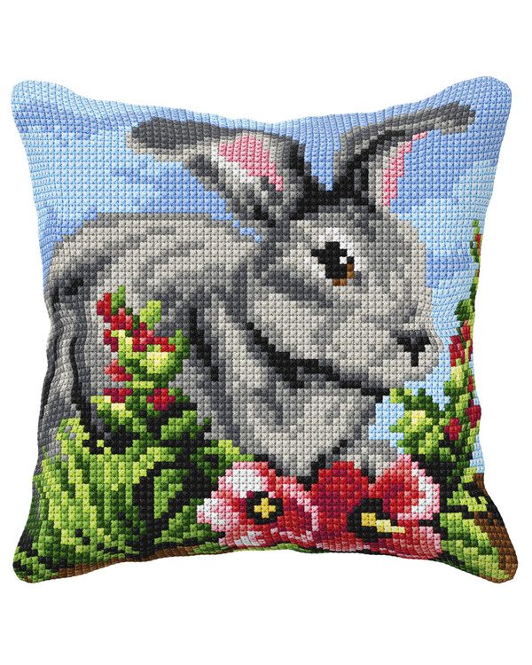 Lav en dekorativ pude med dette broderikit i korssting med et detaljeret motiv af en kanin blandt blomster.