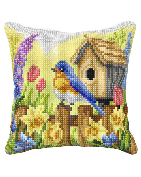 Broder en charmerende pude i korssting med en farverig fugl ved sin fuglekasse, omgivet af blomster og grønt.