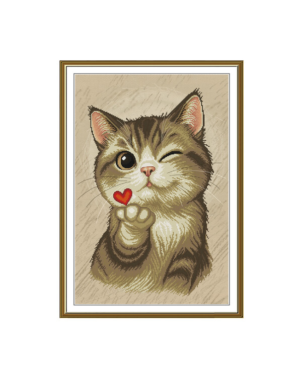 Et sødt og legende motiv med en blinkende kat, der holder et rødt hjerte. Perfekt som gave eller til at sprede lidt ekstra kærlighed i hjemmet.