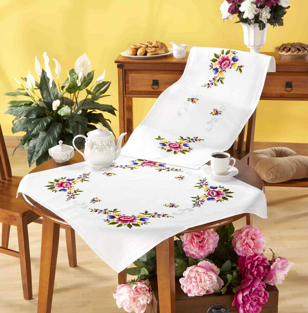Broderes med moulinégarn i korssting påtrykt hvidt bomuldsstof. Færdig konfektioneret med indvævet bort. Str. ca. 40x80 cm,